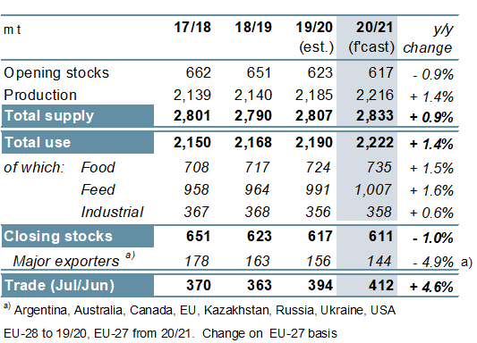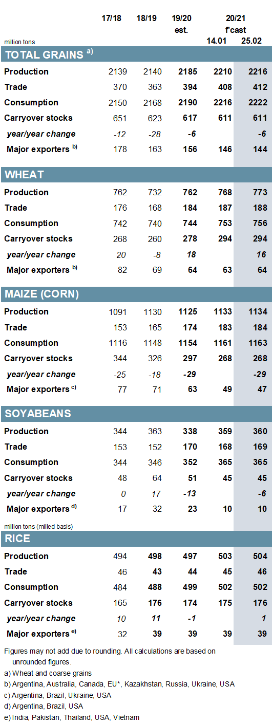 Согласно прогнозу, мировое производство зерновых (пшеница и фуражное зерно) в 2020/21 году вырастет на 31 млн. тонн по сравнению с предыдущим годом до рекордных 2 216 млн. тонн, при этом наибольший рост ожидается для пшеницы (+ 11 млн.) и кукурузы (+ 9 млн.). Ожидается, что общее потребление вырастет на 31 млн. тонн до 2 222 млн., при этом почти весь рост приходится на продовольственное и кормовое потребление. Ожидается сокращение мировых остатков на 6 млн. тонн до пятилетнего минимума в 611 млн., но при этом все сокращение связано с четвертым подряд сокращением для кукурузы – до наименьшего уровня за восемь сезонов. Ожидается, что объем торговли в 2020/21 году будет рекордным и составит 412 млн. тонн (+ 18 млн. год к году), включая поставки пшеницы и кукурузы на рекордном уровне.