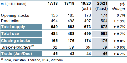 На уровне 504 млн. тонн мировое производство риса в 2020/21 году немного повышено по сравнению с предыдущим месяцем до нового рекорда. Прогноз по потреблению сохраняется на прежнем уровне, но из-за более высоких начальных запасов остатки на конец сезона увеличиваются примерно на 1 млн. тонн до 176 млн. (+2 млн. год к году). Мировой спрос на импорт в 2021 году (январь / декабрь) прогнозируется на уровне 46 млн. тонн, что представляет собой рост на 2 млн. по сравнению с предыдущим годом.