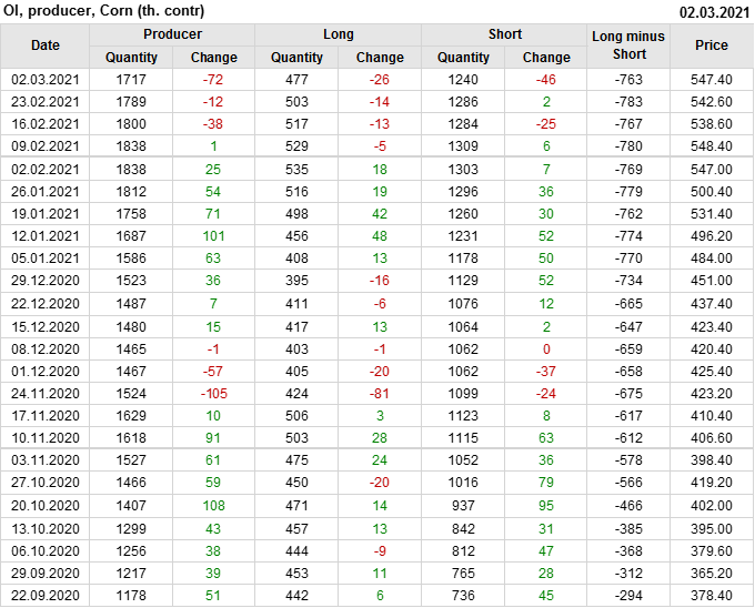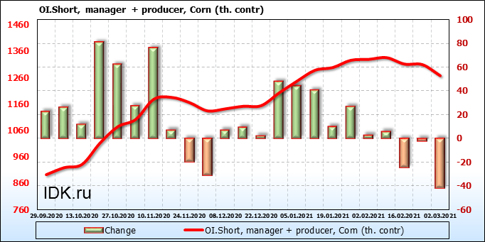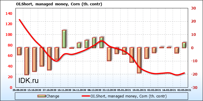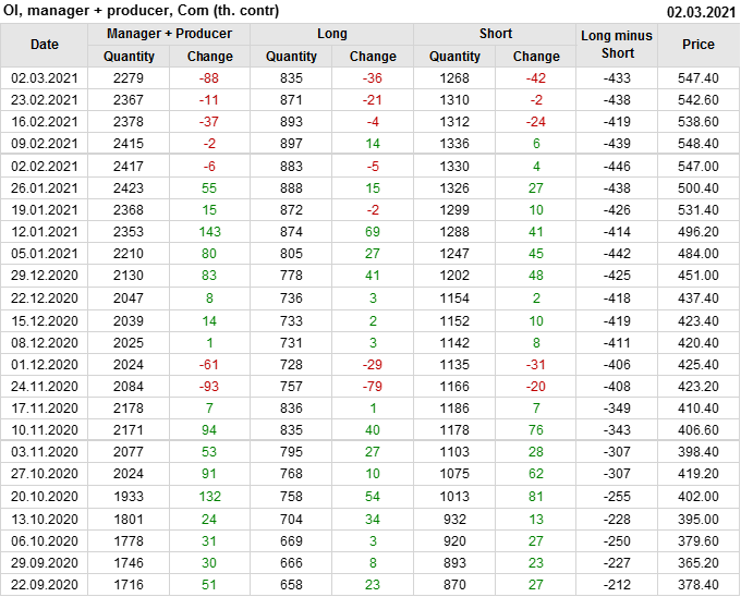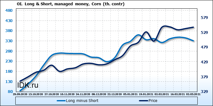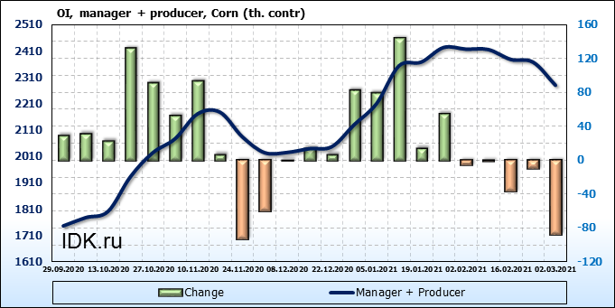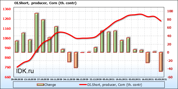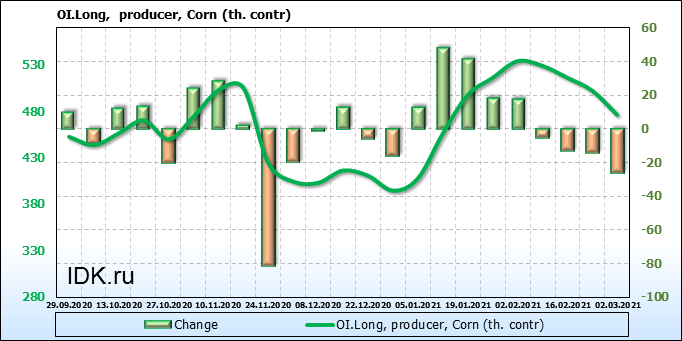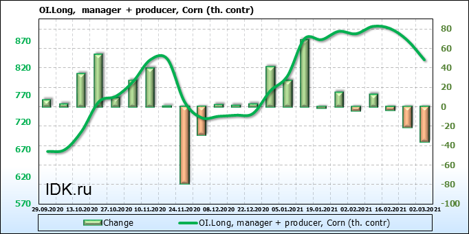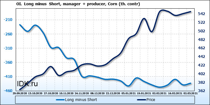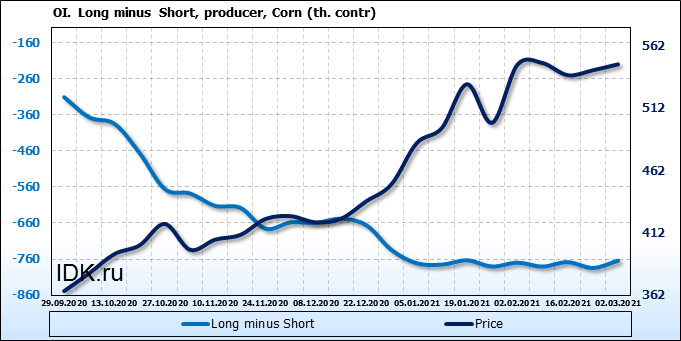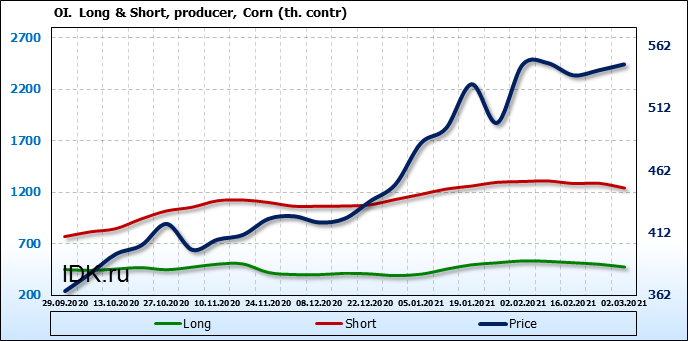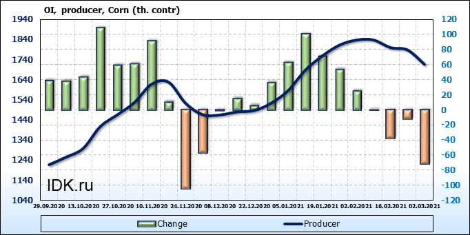 За прошлую неделю, 24.02.21 — 02.03.21, разница между длинными и короткими позициями производителей выросла на 20 тыс. контрактов. В тоже время, цена выросла на 4.8 цента. Производители не торопятся наращивать продажи, предполагая, что возможен рост цены в ближайшее время.