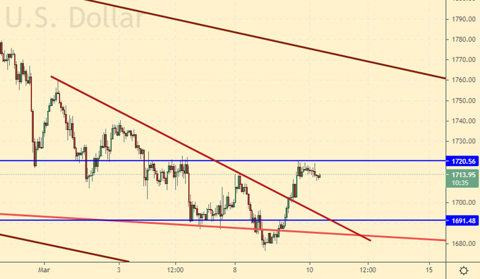 Отошли от локальных минимумов. Главный вопрос: «Это всё?» До заседания ФРС есть время, поэтому, мы без проблем можем откатить к верхней границе падающего канала, в район 1760. Дальше всё будет зависеть от того, поверит рынок в силу доллара или нет.
