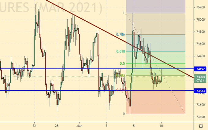 Покупка: в случае роста выше 74.70. Стоп: 74.10. Цель: 85.00. Сейчас. Стоп: 73.60. Цель: 85.00. Кто в позиции от 74.20, держите стоп на 73.60. Цель: 85.00.