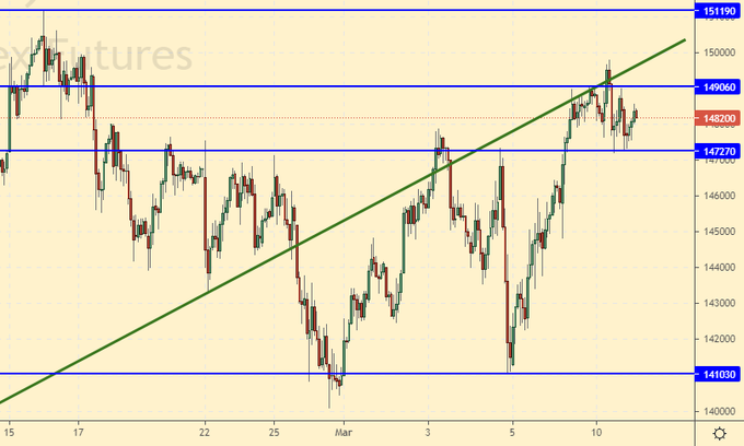Если рубль возьмет курс на 70.00, то индекс РТС может показать новые локальные максимумы. Однако, пока для воплощения данного предположения нет технических оснований. Индекс должен уходить выше 150000 для того, чтобы можно было рассуждать о возобновлении роста. А пока этого не произошло, будем смотреть вниз.