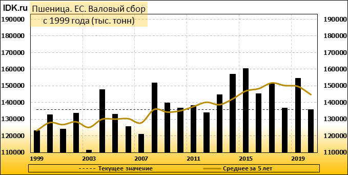 Согласно мартовскому прогнозу МСХ США, производство пшеницы в странах ЕС в 2020/21 году составит 135,80 млн. тонн, что на 18,71 млн. тонн (12,11 процентов) меньше, по сравнению с прошлым годом. Аналогичный объем производства прогнозировался в феврале.