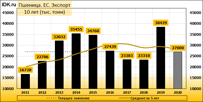 Оценки урожайности и уборочной площади также не изменились по сравнению с прошлым месяцем. Урожайность оценивается в 5,52 тонны с гектара, уборочная площадь — в 24,61 миллиона гектаров. Прогноз по экспорту пшеницы из ЕС в 2020/21 году, как и прошлом месяце, остается на уровне 27 млн. тонн.