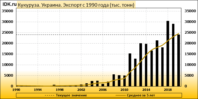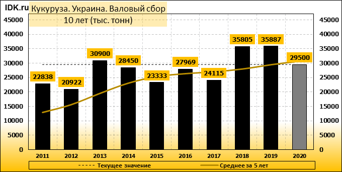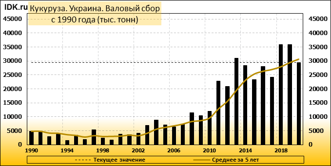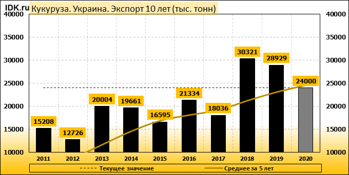 Согласно мартовскому отчету WASDE производство кукурузы в Украине в 2020/21 году оценивается в 29,5 миллиона метрических тонн, без изменений по сравнению с прогнозом прошлого месяца, но на 17,8 процентов меньше, чем было произведено в прошлом году. Оценки урожайности и уборочной площади также не изменились по сравнению с прошлым месяцем. Урожайность оценивается в 5,46 тонны с гектара, уборочная площадь — в 5,40 миллиона гектаров. Прогноз по экспорту кукурузы из Украины в этом месяце остался на прежнем уровне и составляет 24 млн. тонн.