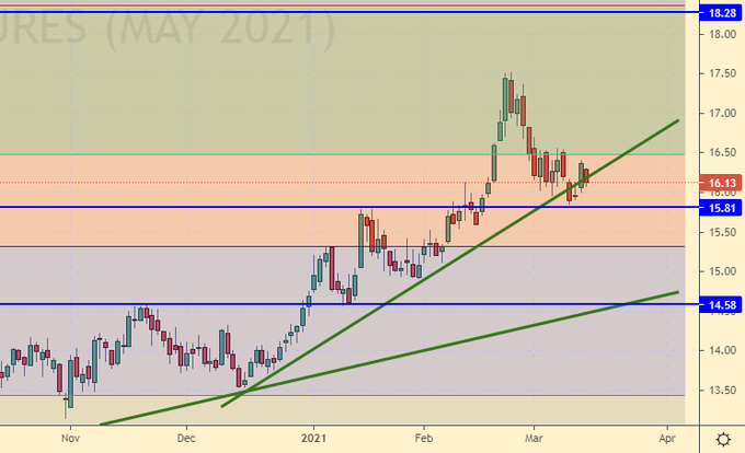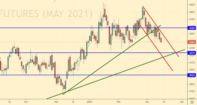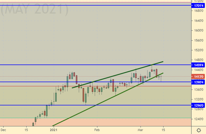 Сценарий роста: рассматриваем майский фьючерс, дата экспирации 14 мая. У масличной культуры есть потенциал для захода на 1700.0. Здесь можно покупать, однако, стоп ставим чуть ли не вплотную.