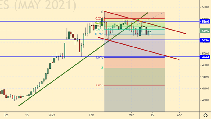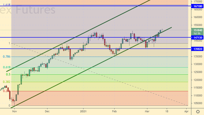Сценарий роста: рассматриваем мартовский фьючерс, дата экспирации 18 марта. Показали новый максимум. Не исключено, что 17-го марта Пауэлл вдохновит фондовые рынки на новые высокие подвиги, и какая-то часть от всеобщего виртуального благоденствия перепадет и российскому рынку. Купим в расчете на подъем к 167000.