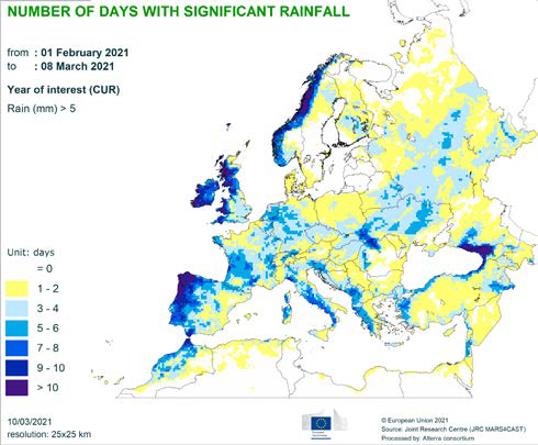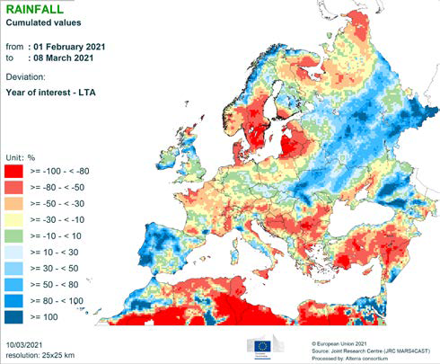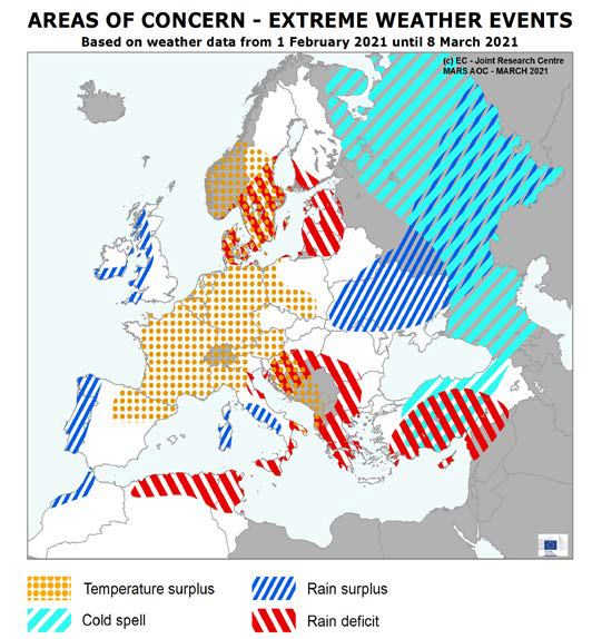 Обильные дожди прошли в Португалии, северной Испании, центральной Италии, Украине и России, что в основном положительно сказалось на посевах и пополнении водохранилищ. Сохраняющиеся влажные условия на юге Ирландии и западных частях Соединенного Королевства препятствовали началу весенних полевых работ, но сухое начало марта позволило фермерам наверстать большую часть задержки.