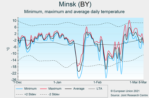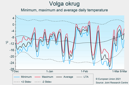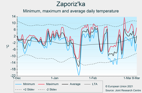 Температуры в декабре и начале января были преимущественно выше долгосрочных средних значений (LTA). Холодные периоды во второй декаде января и первых двух декадах февраля с минимальными температурами ниже -20 ℃ прошли, не оказав серьезного воздействия на полностью закаленные и покрытые снегом озимые зерновые.