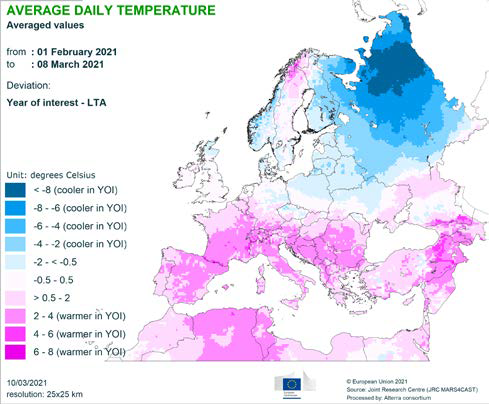 Большая часть Западной и Северной Европы (Франция, Германия, страны Бенилюкса, Дания, Швеция), а также Австрия, Словения и Хорватия испытали исключительно высокие температуры (от +4 ° C до +6 ° C выше LTA) в течение двух недель после заморозков, о которых сообщалось в февральском бюллетене. В некоторых из этих регионов температура повысилась с -15 ° C до более чем +15 ° C. Теплая погода способствовала быстрому таянию снега и возобновлению роста и развития после зимнего покоя.