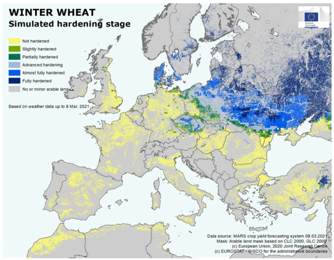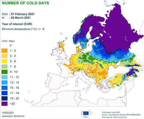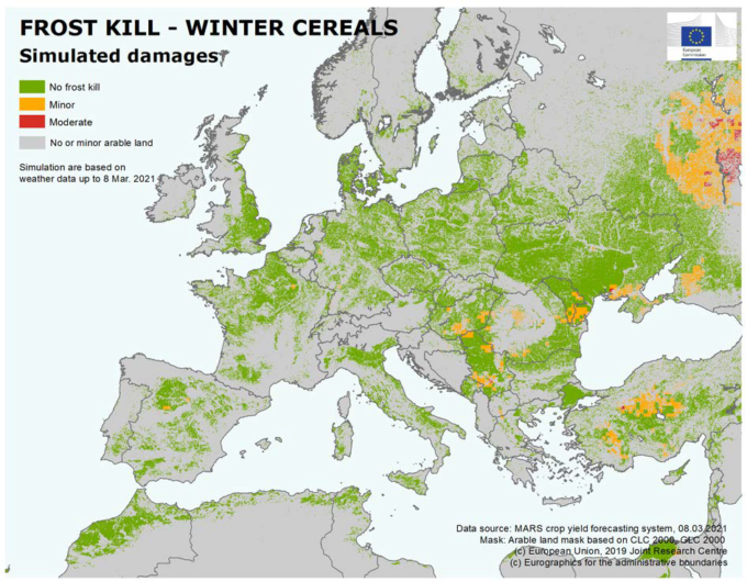 Аномально холодная погода, прогнозируемая на ближайшие дни (8–16 марта) на юге европейской части России и в юго-восточной Европе, может нанести дополнительный ущерб, поскольку озимые зерновые в этих регионах имеют очень слабую морозостойкость или не имеют ее вовсе.