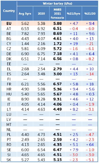 Прогноз урожайности озимого ячменя (т/га) на 2021 г.