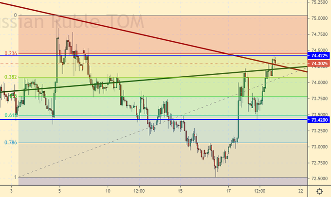 Рубль после обзывательств Байдена чувствует себя плохо. На USD/RUB_TOM видим, что цены обозначили попытку выхода из канала вверх и уперлись в 74.50. Если сегодня данный уровень будет взят, мы будем рекомендовать усиливать покупки американской валюты. Индекс RGBI не поднимает головы в последние пару дней, что говорит о продолжающейся потери перспектив по российскому госдолгу.