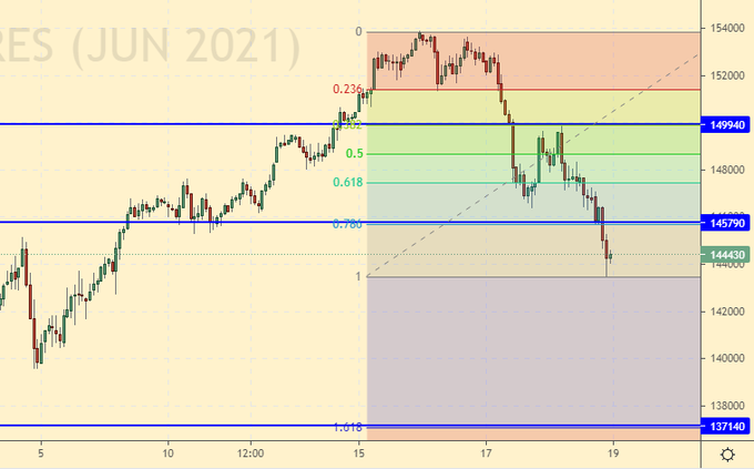 Рубль «помог» индексу РТС показать локальный минимум. Импульс вниз практически завершен. Ждем откат к 149000 и продаем (наращиваем) позиции, так как вряд ли на уровне 144000 закончится текущее падение.