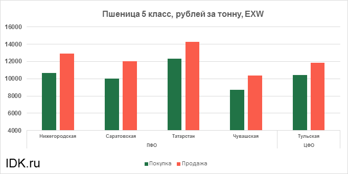 За прошедшую неделю с 15.03.2021 по 19.03.2021 средняя цена на пшеницу 5-го класса, согласно выставленным заявкам трейдеров, упала по всем округам на 794 рубля. Средняя цена составляет 11350 рублей за тонну.