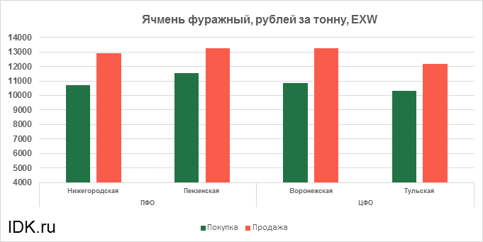 За прошедшую неделю с 15.03.2021 по 19.03.2021 средняя цена на фуражный ячмень, согласно выставленным заявкам трейдеров, выросла по всем округам на 1203 рубля. Средняя цена составляет 11774 рубля за тонну.