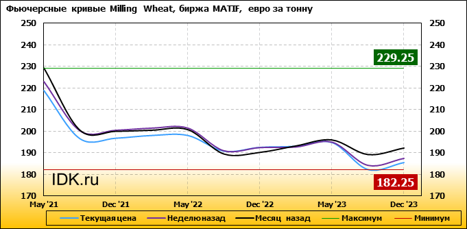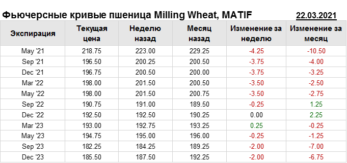 На 22.03.2021 стоимость пшеницы Milling Wheat на бирже MATIF по контракту May ’21 составила 218.75 евро за тонну. За прошедшую неделю стоимость пшеницы Milling Wheat упала на 4.25 евро/тонна. Как мы видим на графике, фьючерсная кривая имеет периоды, когда более дальний фьючерс дешевле ближнего. Состояние бэквардации наблюдаем на следующих контрактах: Sep ’21; Sep ’22; Sep ’23. Таким образом, трейдеры предполагают, что возможно превалирование предложения над спросом в указанные периоды.