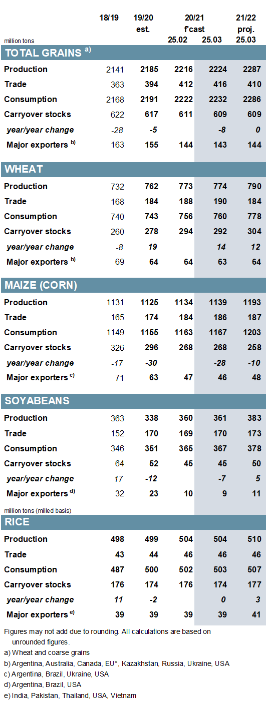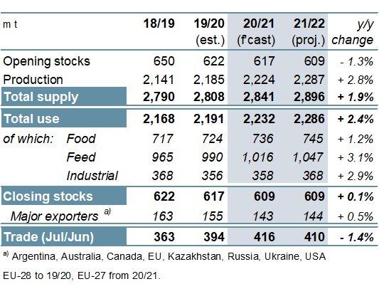 Ожидается, что на рекордном уровне в 2 224 млн. тонн мировое производство всех зерновых (пшеница и фуражное зерно) в 2020/21 году будет на 39 млн. больше прошлогоднего, включая рекордные урожаи пшеницы, кукурузы и ячменя. Ожидается четвертое подряд сокращение мировых переходящих остатков до 609 млн. тонн, что на 8 млн. меньше показателя предыдущего года, полностью из-за дальнейшего истощения запасов кукурузы. Прогнозируется, что объем торговли достигнет рекордных 416 млн. тонн (+ 22 млн. год к году), при рекордных поставках пшеницы и кукурузы.