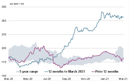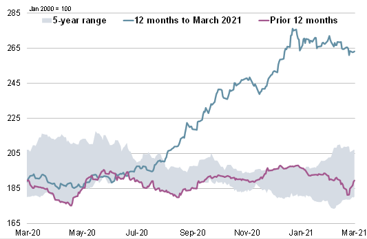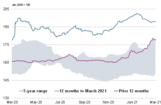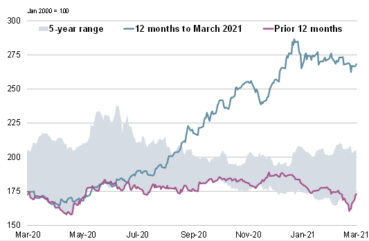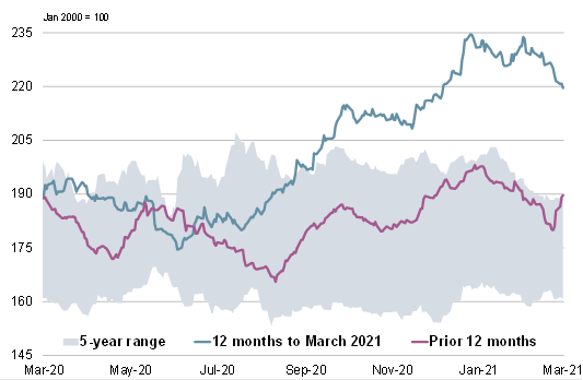 При ослаблении на всех рынках, особенно на рынке пшеницы и ячменя, IGC GOI в марте снизился на 3%, но средние цены на зерно и масличные культуры по-прежнему значительно выше прошлогодних.