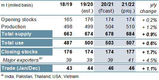 С учетом увеличения урожая у экспортеров, мировое производство риса в 2020/21 году прогнозируется на 1% выше по сравнению с прошлым годом, на уровне в 504 млн. тонн. Включая расширение кормового потребления в Китае, ожидается дальнейший рост мирового потребления, в то время как запасы, как ожидается, мало изменятся по сравнению с прошлым годом. Ожидается, что благодаря более активным закупкам импортеров в Азии и Африке торговля вырастет на 4% год к году в 2021 году. Перспективы на 2021/22 год остаются предварительными, однако более крупные посевы в Азии могут повысить мировое производство, при этом общее потребление и остатки также прогнозируются на рекордном уровне. Согласно прогнозу, в 2022 году объем торговли останется на высоком уровне, благодаря спросу в Африке.