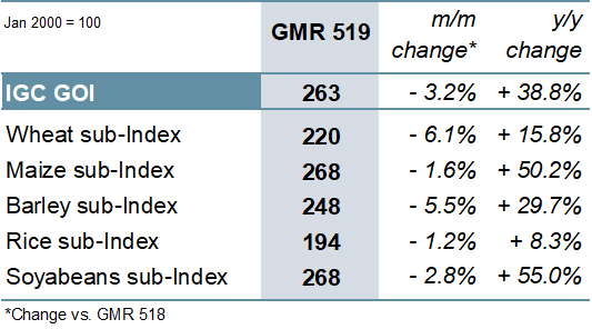 Индекс зерновых и масличных культур IGC (GOI) упал на 3% по сравнению с предыдущим месяцем. Все составляющие его субиндексы снизились месяц к месяцу, при этом наибольшее падение произошло по пшенице и ячменю.