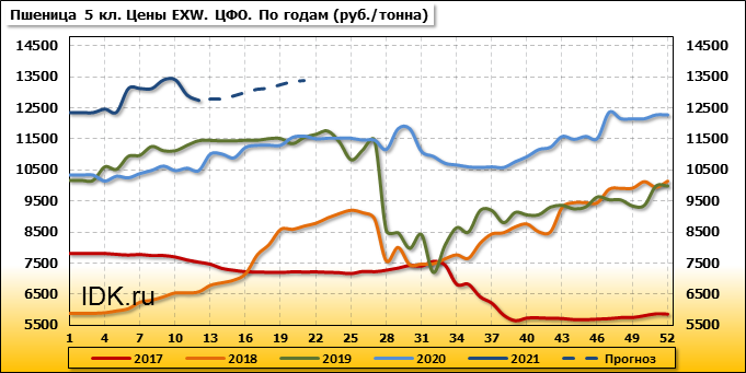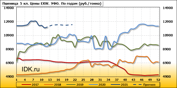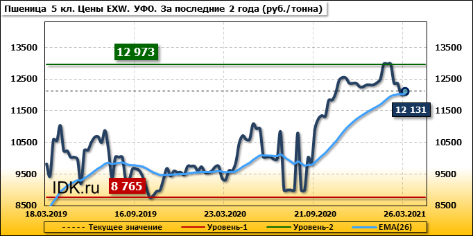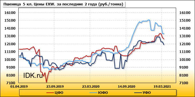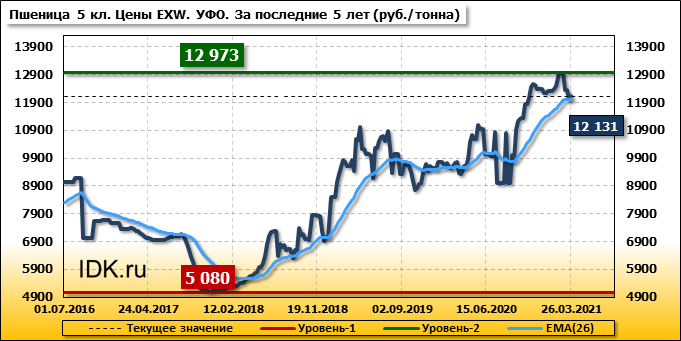 Цены на пшеницу 5-го класса повысились на 114 руб./т. и на данный момент составляют 12131 рубль за тонну.