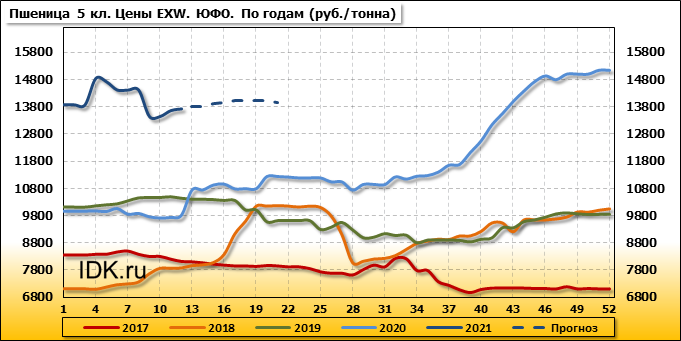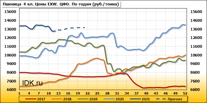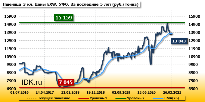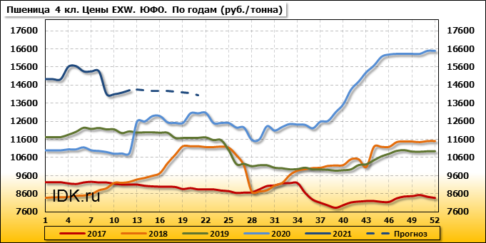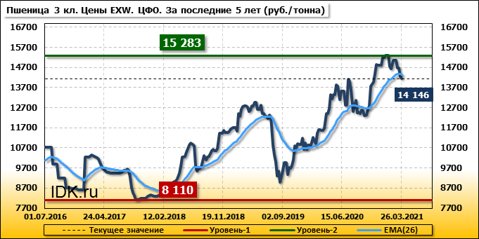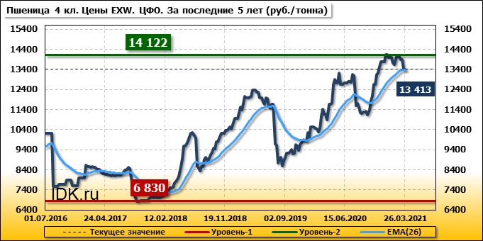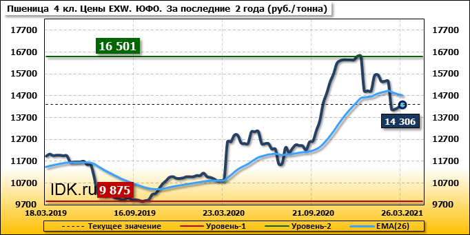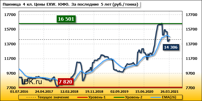 Цены на пшеницу 4-го класса поднялись на 137 руб./т. и на данный момент составляют 14306 рублей за тонну.