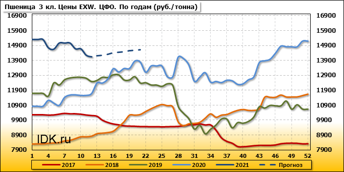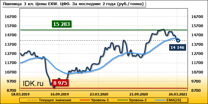За прошедшую неделю в Центральном федеральном округе внутренние цены на пшеницу 3 класса упали на 98 руб./т. и на данный момент составляют 14146 рублей за тонну.