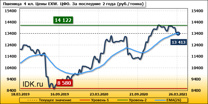 Цены на пшеницу 4-го класса снизились на 8 руб./т. и на данный момент составляют 13413 рублей за тонну.