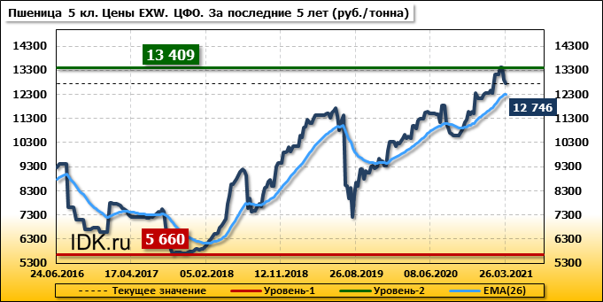 Цены на пшеницу 5-го класса понизились на 165 руб./т. и на данный момент составляют 12746 рублей за тонну.