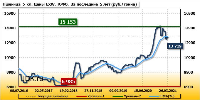 Цены на пшеницу 5-го класса повысились на 64 руб./т. и на данный момент составляют 13719 рублей за тонну.