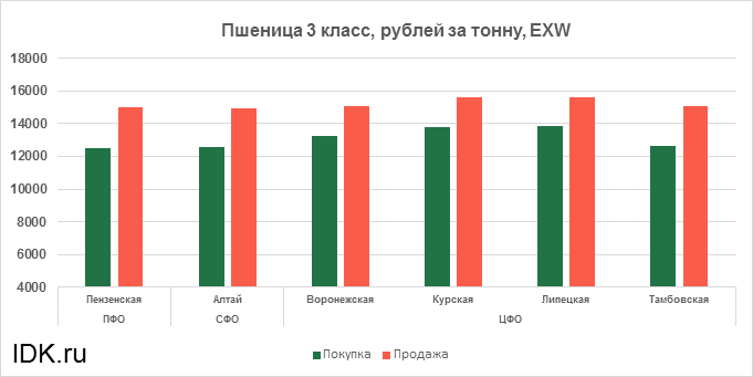 За прошедшую неделю с 22.03.2021 по 26.03.2021 средняя цена на пшеницу 3-го класса, согласно выставленным заявкам трейдеров, упала по всем округам на 131 рубль. Средняя цена составляет 13955 рублей за тонну.