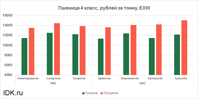 За прошедшую неделю с 22.03.2021 по 26.03.2021 средняя цена на пшеницу 4-го класса, согласно выставленным заявкам трейдеров, упала по всем округам на 117 рублей. Средняя цена составляет 13048 рублей за тонну.