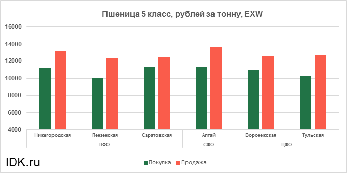 За прошедшую неделю с 22.03.2021 по 26.03.2021 средняя цена на пшеницу 5-го класса, согласно выставленным заявкам трейдеров, выросла по всем округам на 402 рубля. Средняя цена составляет 11990 рублей за тонну.