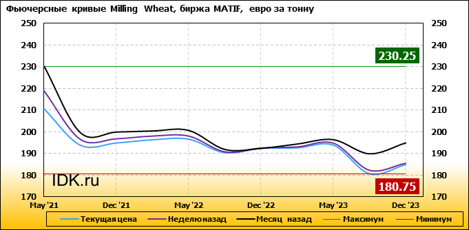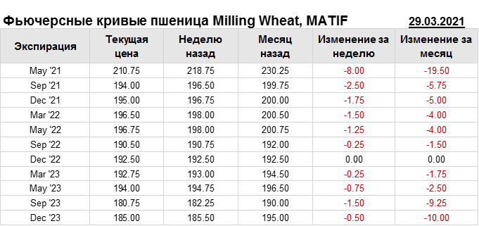 На 29.03.2021 стоимость пшеницы Milling Wheat на бирже MATIF по контракту May ’21 составила 210.75 евро за тонну. За прошедшую неделю стоимость пшеницы Milling Wheat упала на 8 евро/тонна. Как мы видим на графике, фьючерсная кривая имеет периоды, когда более дальний фьючерс дешевле ближнего. Состояние бэквардации наблюдаем на следующих контрактах: Sep ’21; Sep ’22; Sep ’23. Таким образом, трейдеры предполагают, что возможно превалирование предложения над спросом в указанные периоды.