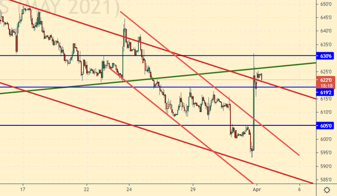 На фоне пусть и незначительного, но все же расширения площадей под кукурузу в США цены резко выросли. Кроме сговора это можно объяснить лишь тем, что аналитики ждали большего увеличения площади сева. Но первое объяснение «про сговор» нравится нам больше. Это атака с целью на 607.0. А если это действительно так, то от 605.0 рекомендуем шорт.