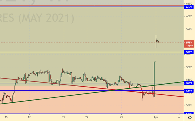 Рынок бурно отреагировал на выход данных по площадям, отведенным для сельскохозяйственных культур в США. Реакция рынка расходится с данными, что говорит о заранее спланированной атаке покупателей. Так рост площадей под пшеницу составил 4.5% (46.358 млн. акров против 44.349 млн. акров). Остаются вопросы к влиянию холодной и засушливой зимы на озимые на юге США, но ни о какой катастрофе речи не идет.