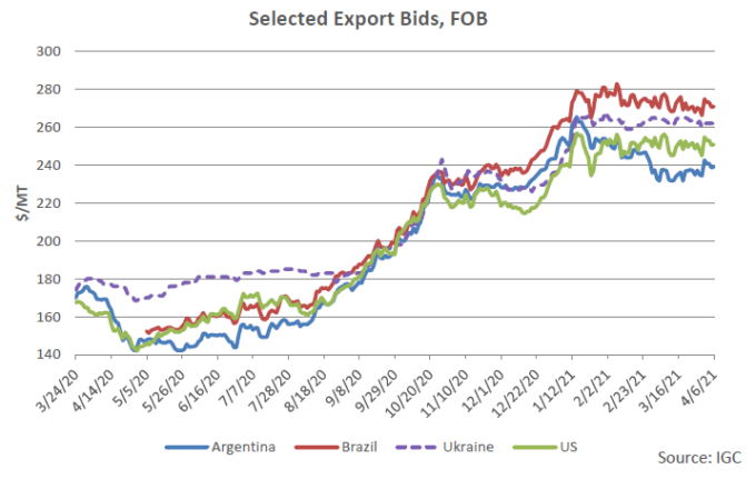 С момента публикации мартовского отчета WASDE, основные экспортные цены на кукурузу остаются практически на том же уровне. Цены в Аргентине выросли всего на 1 доллар за тонну до 239 долларов, оставаясь на самом низком уровне среди основных экспортеров. Бразильские цены, хотя и снизились на 5 долларов за тонну до 271 доллара, продолжают оставаться высокими по сравнению с остальными экспортерами. Украинские цены (которые ранее фигурировали в отчетах как «черноморские») упали на 2 доллара за тонну до 262 долларов. Отчет NASS о предполагаемых посевах был опубликован 31 марта, и планы по посевам не оправдали ожиданий отрасли. Несмотря на рост фьючерсов на кукурузу, экспортные цены в США снизились на 4 доллара за тонну до 251 доллара.