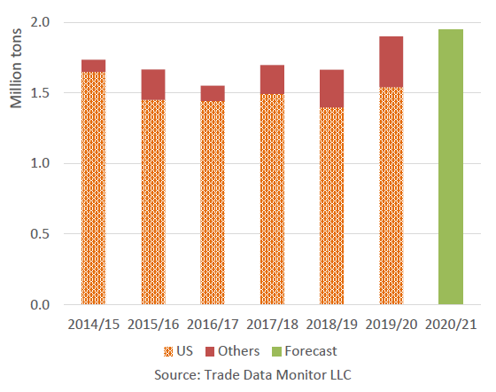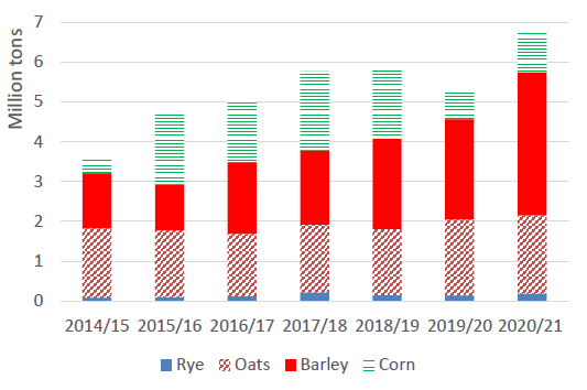 Ожидается, что в 2020/21 году совокупный экспорт фуражных зерновых культур из Канады — кукурузы, ржи, ячменя и овса — достигнет нового максимума, в первую очередь за счет ячменя. Для большей части этого зерна Соединенные Штаты были основным направлением, в то время как экспорт в другие страны также рос.