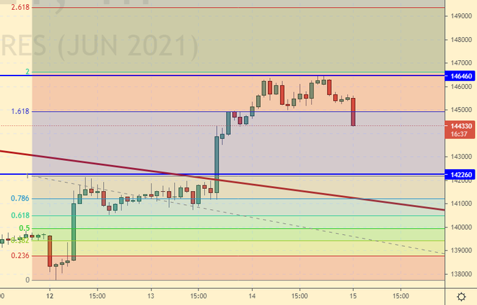 РТС ожидаемо показал рост на фоне возникновения предпосылок переговоров между США и Россией. Вена уже готова принять саммит. Отельеры заработают хоть какую-то «копейку» посреди чумы. Главное чтобы теперь не последовало каких-либо жестких заявлений со стороны Вашингтона, а то они испортят нам тут всю малину. При откате к 142300 – купить.