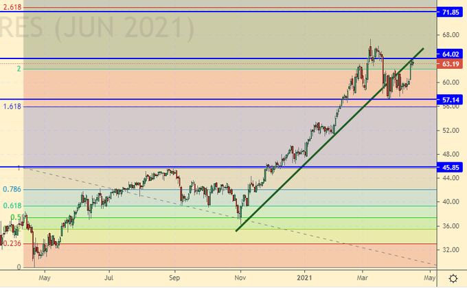 Сценарий падения: «при рывке к 64.00 можно продавать», – писали мы неделей ранее. В данную рекомендацию внесем поправки. Нужен красный день вниз с телом свечи хотя бы 80 центов. Пока его нет, не продаем.
