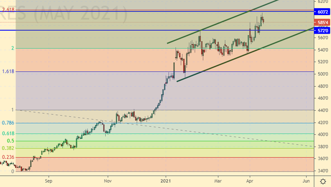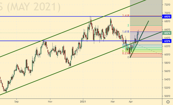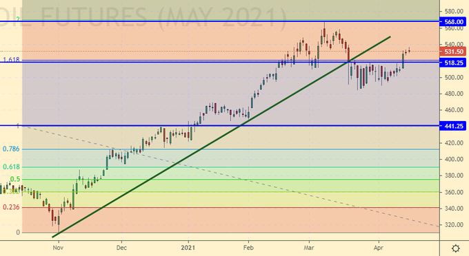 И пшеница, и кукуруза продолжают находиться у локальных максимумов, не подавая серьезных признаков разворота вниз. До майского отчета USDA, где будет первый прогноз по урожаю на сезон 21/22, еще более трех недель. За это время спекулянты могут еще немного поднять рынок, однако, хорошая ситуация с озимыми, будет сдерживать данный рост.