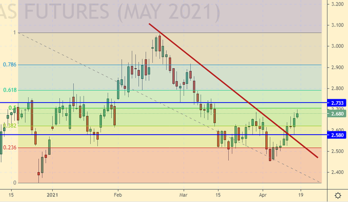 Сценарий роста: рассматриваем майский фьючерс, дата экспирации 28 апреля. Будем держать открытые ранее лонги. Европа должна обеспечить хороший спрос на газ этим летом. Зимы они боятся. «Игра престолов» тому подтверждение.