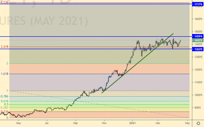 Сценарий роста: рассматриваем майский фьючерс, дата экспирации 14 мая. Как и ранее, считаем, что покупать имеет смысл после роста выше 1470.0. Есть шанс, что соя пройдет к 1720.0.