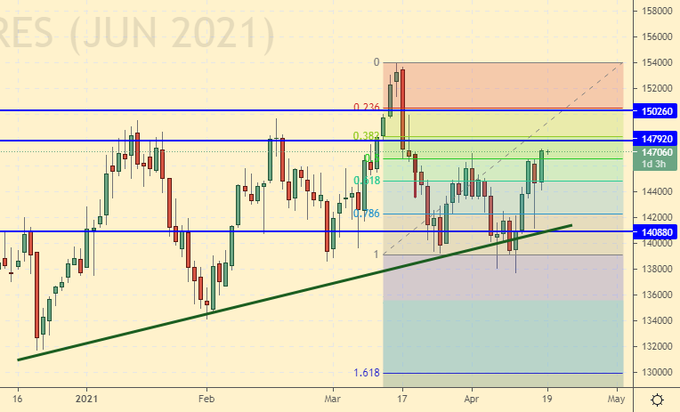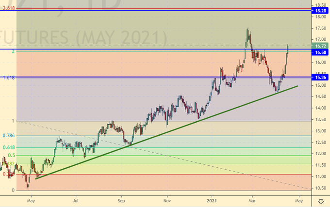 Сценарий роста: рассматриваем майский фьючерс, дата экспирации 30 апреля. Покупка от 14.60 оказалось крайне удачной по соотношению прибыль/риск. Держим лонг. Ждем прилета к 18.20.