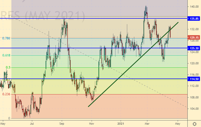 Сценарий роста: рассматриваем майский фьючерс, дата экспирации 18 мая. Лонг не очевиден. Только возврат выше 135.00 заставит нас покупать.