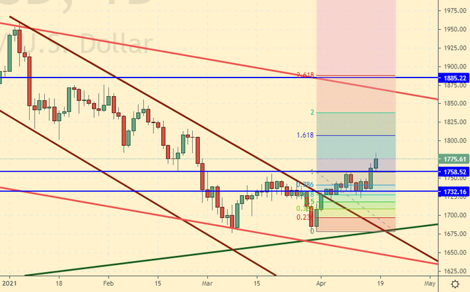 Сценарий роста: «только после закрытия дня выше 1760 будем покупать», – писали мы неделей ранее. Событие наступило. Вы должны быть в лонгах. Держим.