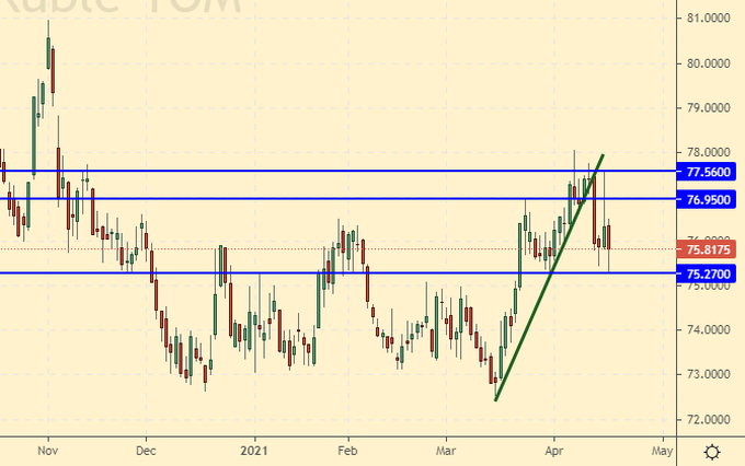 Сценарий падения: вряд ли кто-то из спекулянтов будет ставить на укрепление рубля в текущей ситуации. Надо чтобы Байден успокоился, а этого пока не происходит. Шорт по доллару как рабочую идею не рассматриваем.