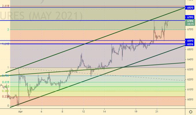 Пшеница уверенно движется к 692.0. Возможен и более сильный рост. Не исключено, что рынок будет расти вплоть до майского отчета USDA. Затем последует откат. Две недели у быков точно есть. Где к тому моменту будут цены сложно предположить. Отметим, что проход выше 700.0, откроет отметку 750.0.