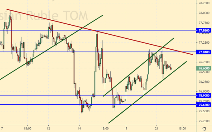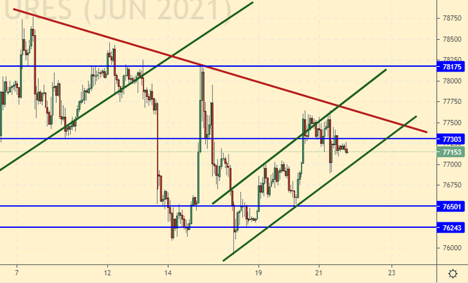 Покупка: нет. Кто в позиции от 76600, держите стоп на 76300. Цель: 100000.